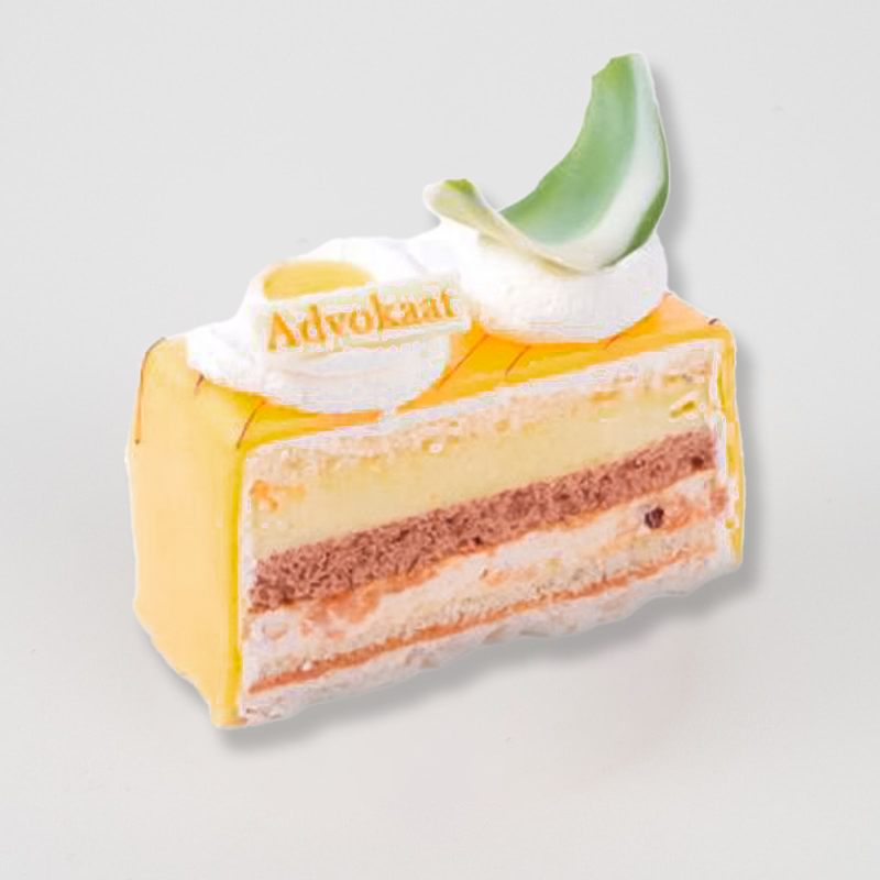 Geniet van dit unieke gebakje van progres schuim bodem met een dun laagje karamel en advocaat bavarois. Het gebakje wordt afgewerkt met een dun laagje marsepein en slagroom. Perfect voor feestelijke gelegenheden of gewoon bij een kopje koffie.