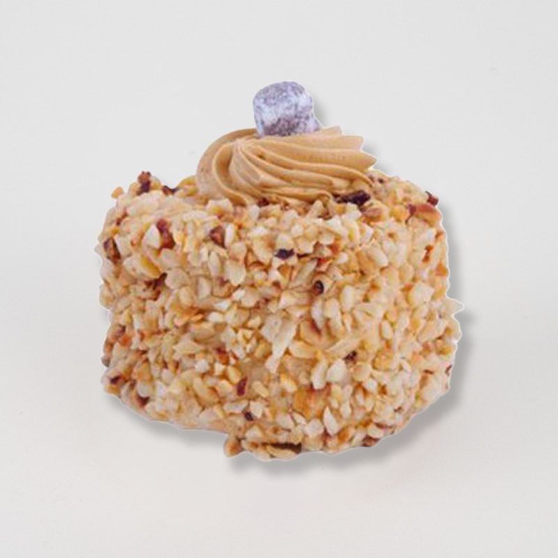 Een glutenvrij gebakje van hazelnootschuim met mokka crème. Wij kunnen geen 100% allergeen vrij garanderen, dit product wordt niet in een aparte ruimte gemaakt.