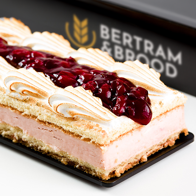 Trakteren? Op het werk, een gezellig feestje of gewoon thuis. Kies dan eens voor ons smakelijk trakteergebak van harde wener bodem met kersen bavarois, geflambeerd eiwit en kersen compote.